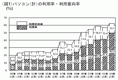 1.パソコンと周辺機器 昨年は小幅な伸びにとどまったパソコンとその周辺機器の利用率だが、今回は大きな伸びを示した。デスクトップ型パソコンは31.0%(昨年比2.1ポイント増)、ノート型パソコンは24.6%(5.5ポイント増)、ミニノートパソコンは7.6%(2.1ポイント増)であり、これらを合わせたパソコン(計)の利用率は49.3%と5割を超える勢いである。その伸び率(7.9ポイント増)は2000年の調査(前年比8.6ポイント増)に次ぐ高いものである(図1)。 パソコン(計)の利用率を年代別にみると(図2)、20~40代での利用率はいずれも6割を大きく超え、30代では71.3%に達した。また、50代以上の年代の利用率も前回と比べて伸びている。今後の利用意向率は横ばいから低下の方向にあるが、20~40代では16.0~22.2%と、依然高い水準を示している。