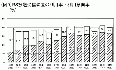 3.AV関連機器、その他の利用状況 BS放送受信装置の利用率は33.1%(1.2ポイント減)で、利用意向率とともにほぼ横ばいから低下の傾向がみられる。BSデジタル受信装置は5.4%(0.9ポイント増)、CS放送受信装置は6.9%(1.2ポイント増)と、ともに微増だった。BSデジタル受信装置は、高い利用意向率を示しているが、実際に利用するまでにはいたらず、それほど伸びていない(図9~11)。今回新設された地上デジタル放送受信装置の利用率は2.6%と低いが、利用意向率は6.2%と高く、今後注目されるところである。微増傾向が続いていたケーブルテレビの利用率は大幅に増加(6.8ポイント増)して21.0%と2割台に乗った(図12)。